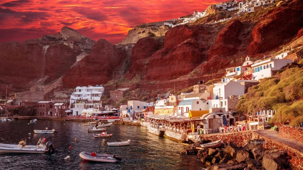 Descending down the picturesque stone steps from Oia, you’ll be greeted by traditional fishing boats bobbing in the crystal-clear waters and colorful buildings perched along the cliffside.