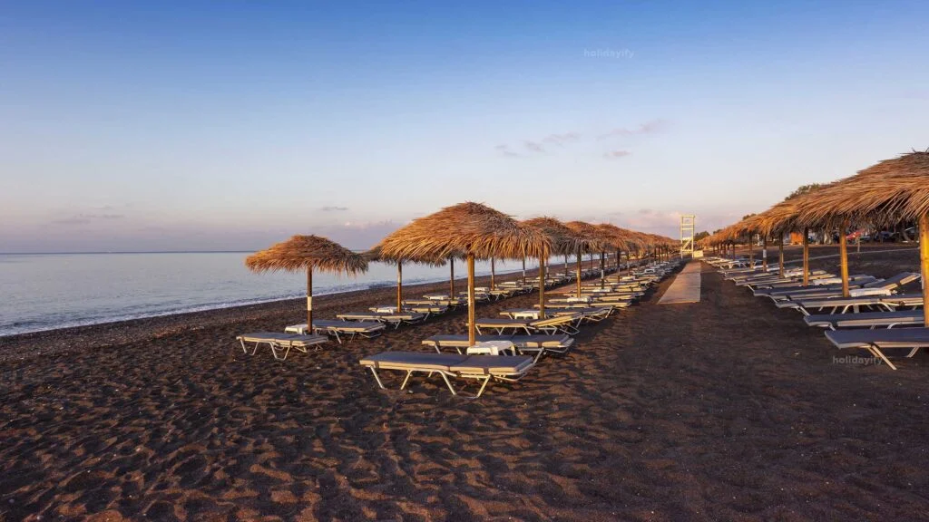 Perissa Beach, located on the southeast coast of Santorini Island, is a popular destination known for its stunning black sand and crystal-clear waters. As you step onto the beach, you’ll be mesmerized by the unique beauty that surrounds you.